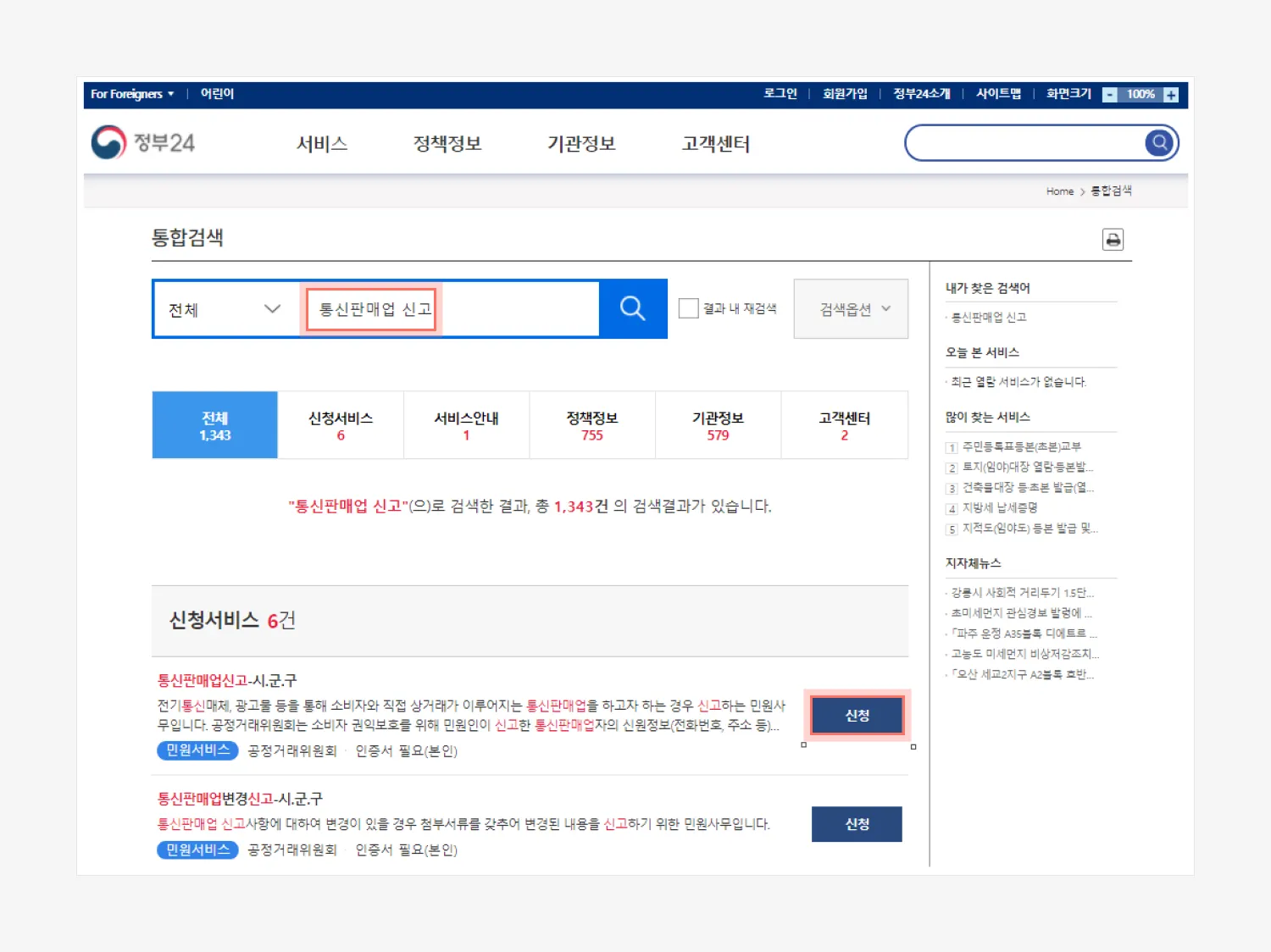 3. 통합 검색에서 '통신판매업 신고' 검색 후 신청 클릭하기